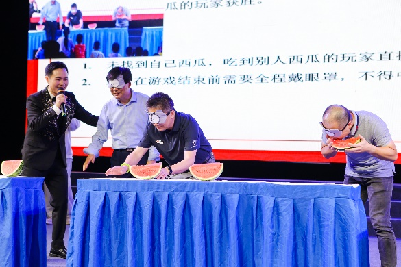 晚会还穿插了互动环节,“挤相框拍照”和“蒙眼吃西瓜”游戏中,系党总支书记和同学们一同参与、同场竞技,共同体验这充满趣味的挑战,将现场气氛推向高潮。