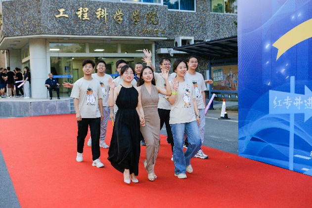 “工成红毯秀”环节,师生们以班级、实验室为单位,纷纷走上红毯,热情签名、温馨合影,表达对母校的不舍和美好祝福。院系领导、导师和班主任代表与毕业生们共同分享喜悦,希望他们能够在未来的道路上自强不息、奋发向上。