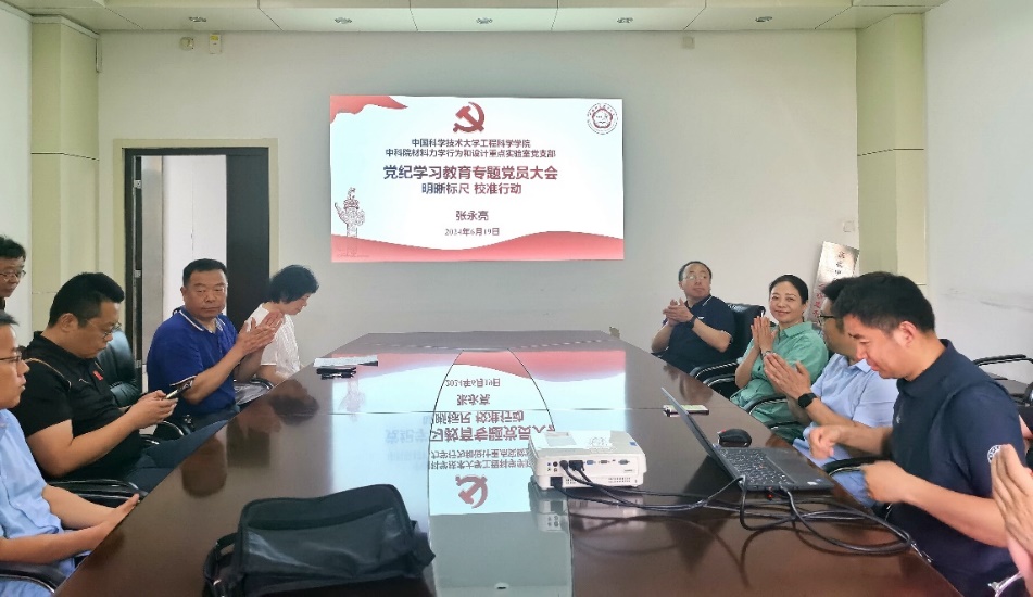 619日,中科院材料力学行为和设计重点实验室党支部召开党员大会,进行党纪学习教育专题学习。会议由党支部书记吴尚犬主持,学院党委副书记牟玲应邀出席会议。